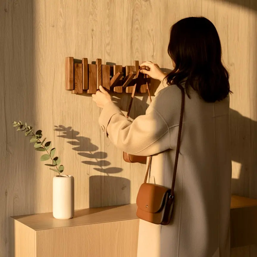 El perchero de pared Verona representa la esencia del diseño nórdico contemporáneo: funcionalidad inteligente envuelta en una estética depurada. Cada pieza está cuidadosamente elaborada en madera natural seleccionada, con ganchos plegables que desaparecen cuando no los necesitas, preservando la armonía visual de tu espacio.